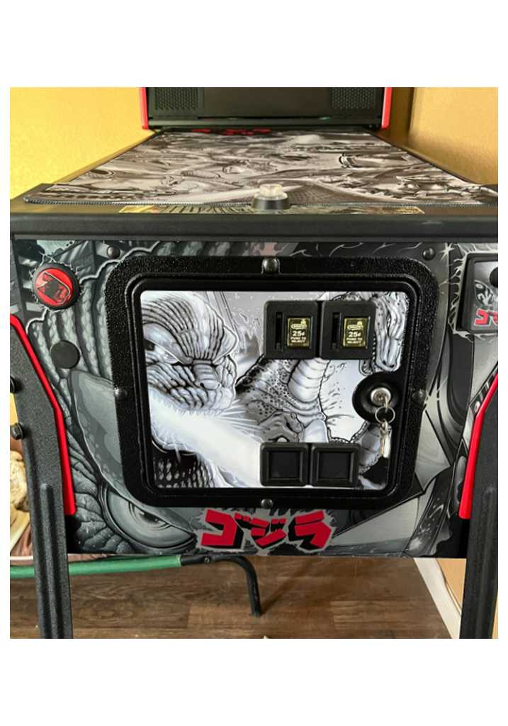 Full color coin door mod for Godzilla 70th Anniversary pinball machine. Precision laser cut to fit perfectly on the coin door with cutouts for the coin drops and coin returns. Made from flexible and durable plastic material that is magnetic so it attaches and removes easily. Installs in under 5 seconds!